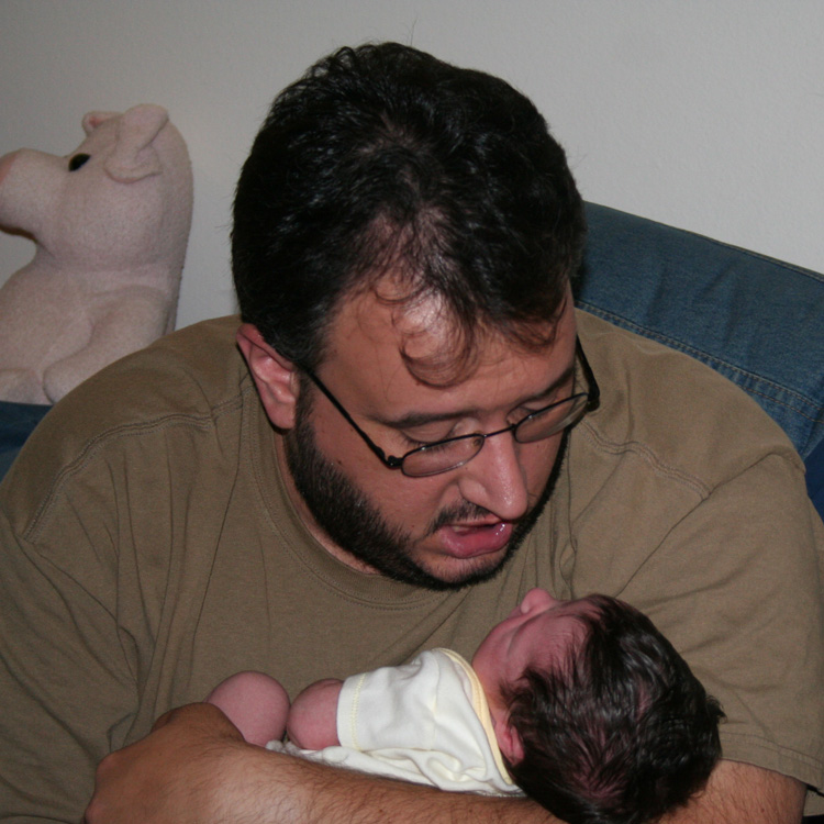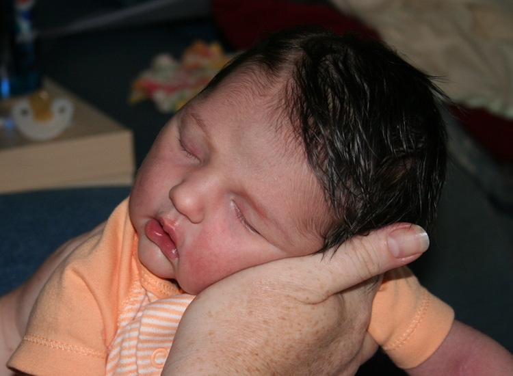 ![]() ![]() Zoe sleeping. She does that... a lot. ![]() Zoe taking one of her first baths. She wasn't sure what was going on, but is slowly getting the idea. ![]() Drying her off from her bath. She likes to suck on towels. Notice how her hair is curly? It'll straighten out in about an hour. ![]() Zoe all set for a big day. ![]() My dad is finally over his cold and finally gets to hold his first granddaughter. He's a happy man. ![]() Zoe isn't even 2 weeks old in this picture, but her feet are already 3.75 inches (9.5 cm) long. ![]() Here, Zoe is relaxing on mom's lap, just looking around. ![]() Since I'm off work, I don't have to shave. But will Zoe recognize me without the beard? ![]() Zoe loves to sleep with us in bed. Especially because Val and I are both nice and cozy. ![]() "Daddy, I'm ready for my close-up!" |