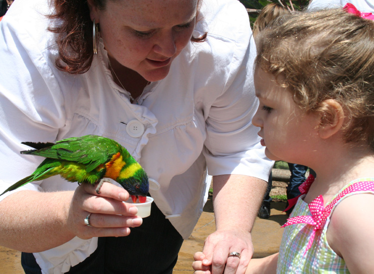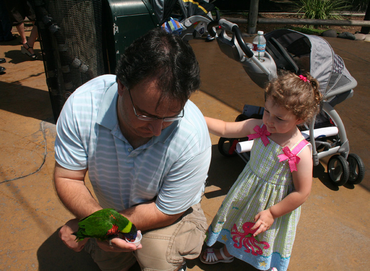 ![]() ![]() The Aquarium of the Pacific also has "Lorikeet Forest" where you can feed nectar to lorikeets. ![]() Zoe seems a little worried by the whole prospect... ![]() ...and maybe with good cause. Look at this bird. Cross it and it'll peck your frakking face off. ![]() She seems willing to try it, though. ![]() "You're doing a good job, daddy." ![]() "Daddy. These birds are beginning to creep me out a bit. Can we go now?" ![]() What? Like we wouldn't do this shot... again.  |